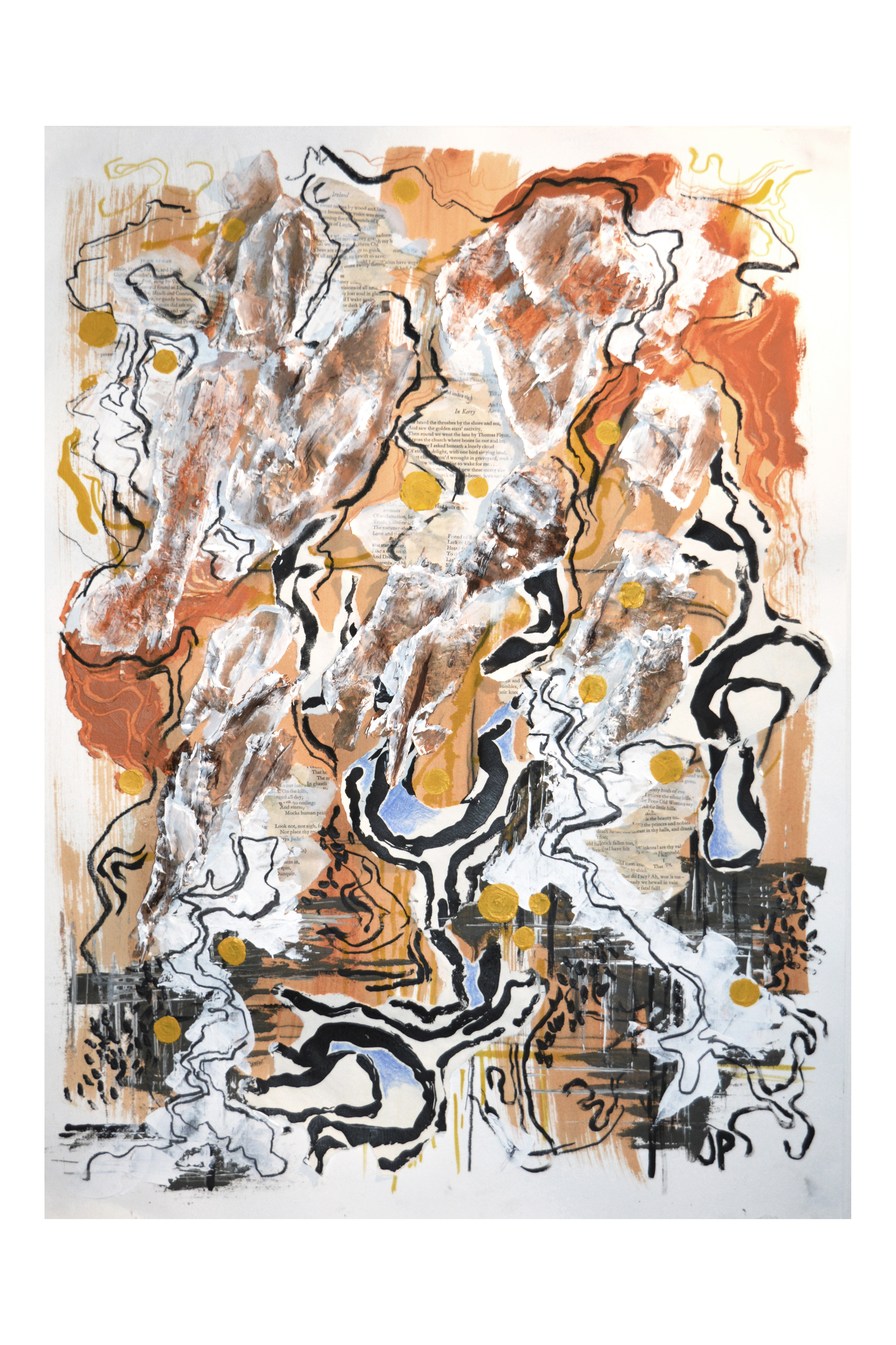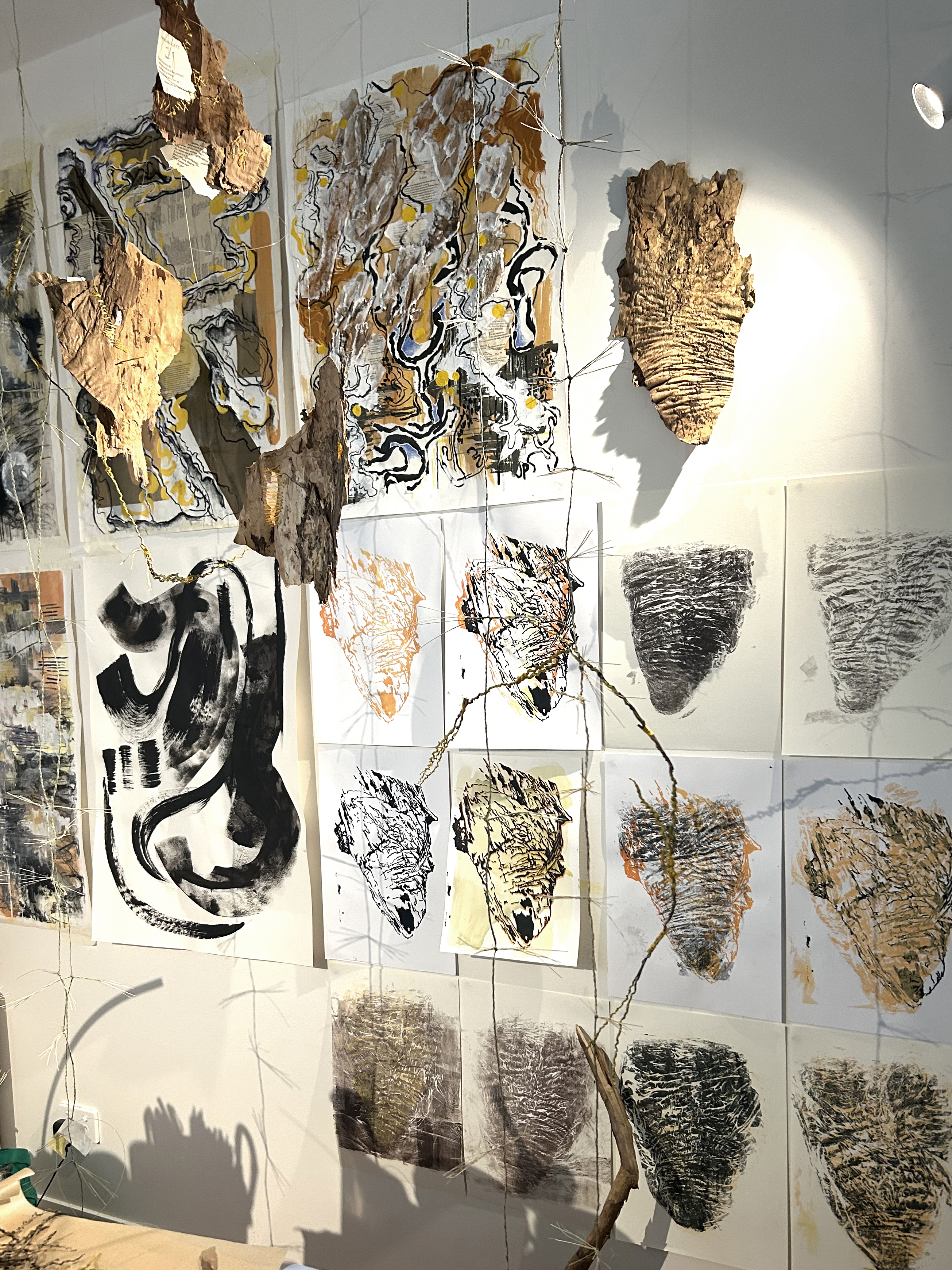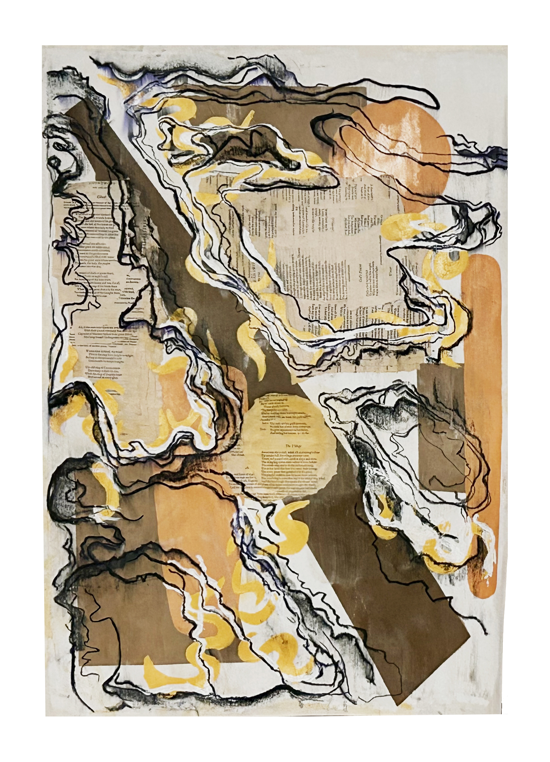 Exploring the intersection of place, memory, and heritage through conversations between two landscapes: the Burren in Ireland and my home here in Merri-bek. This research-based practice investigates how displacement, migration, and cultural inheritance shape contemporary identity, examining the ongoing effects of my own family’s Irish diaspora through material and metaphorical layers. Using mixed media including print, acrylic, charcoal, collage, silk, and found objects, I layer personal and collective narratives that speak to broader questions of belonging.